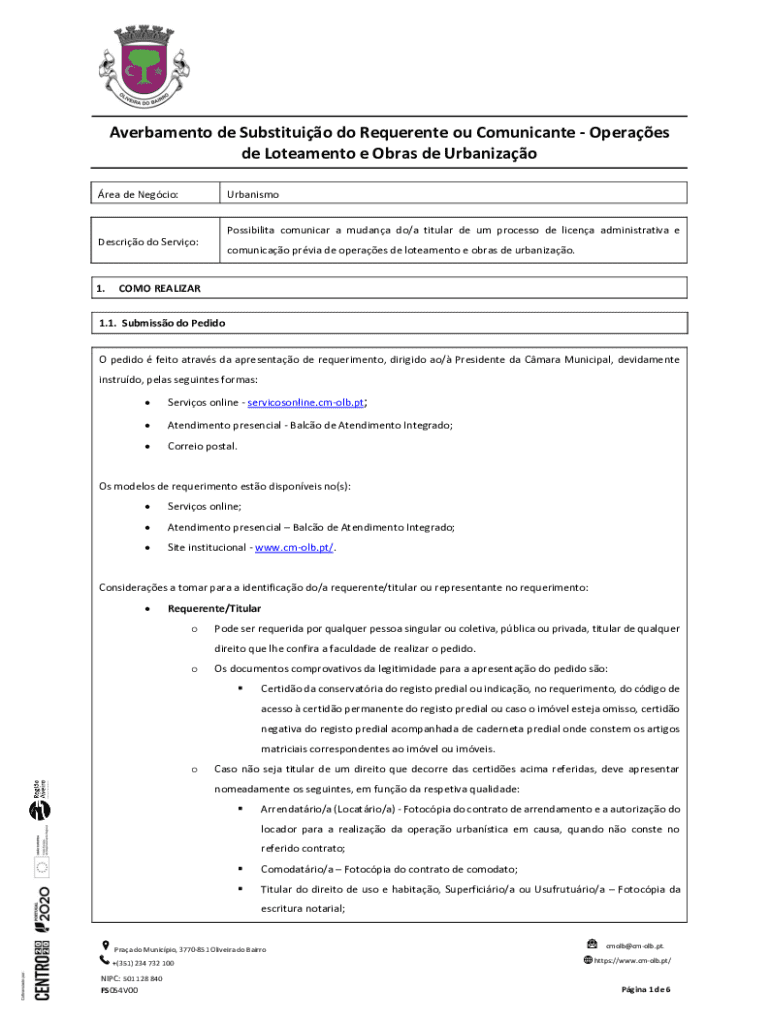 Averbamento de Substituio do Requerente ou Comunicante Operaes de Loteamento e Obras de Urbanizao rea de Negcio:Urbanismo Possibilita comunicar a mudana do/a titular de um processo de licena administrativa