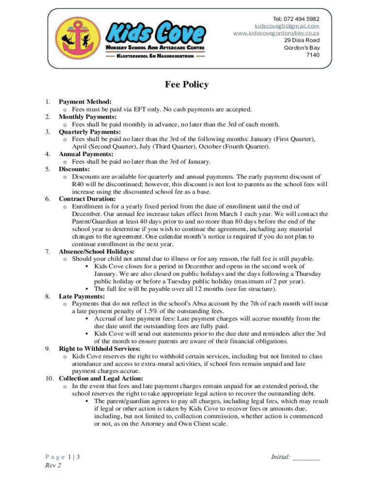 Tel: 072 494 5982 kidscovegb@gmail.com www.kidscovegordonsbay.co.za 29 Disa Road Gordons Bay 7140Fee Policy 1.Payment Method: o Fees must be paid via EFT only. No cash payments are accepted. 2. Monthly