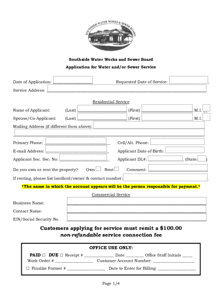 This document is an application form for requesting water and/or sewer service from the Southside Water Works and Sewer Board. It includes sections for applicant details, service address, contact information, and conditions for service. It also outlines additional services such as garbage collection and a voluntary donation to local schools.