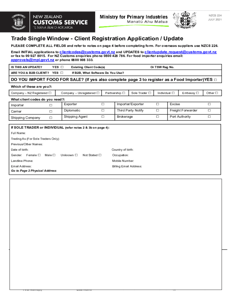 NZCS 224 JULY 2021Trade Single Window Client Registration Application / Update PLEASE COMPLETE ALL FIELDS and refer to notes on page 4 before completing form. For overseas suppliers use NZCS 226.