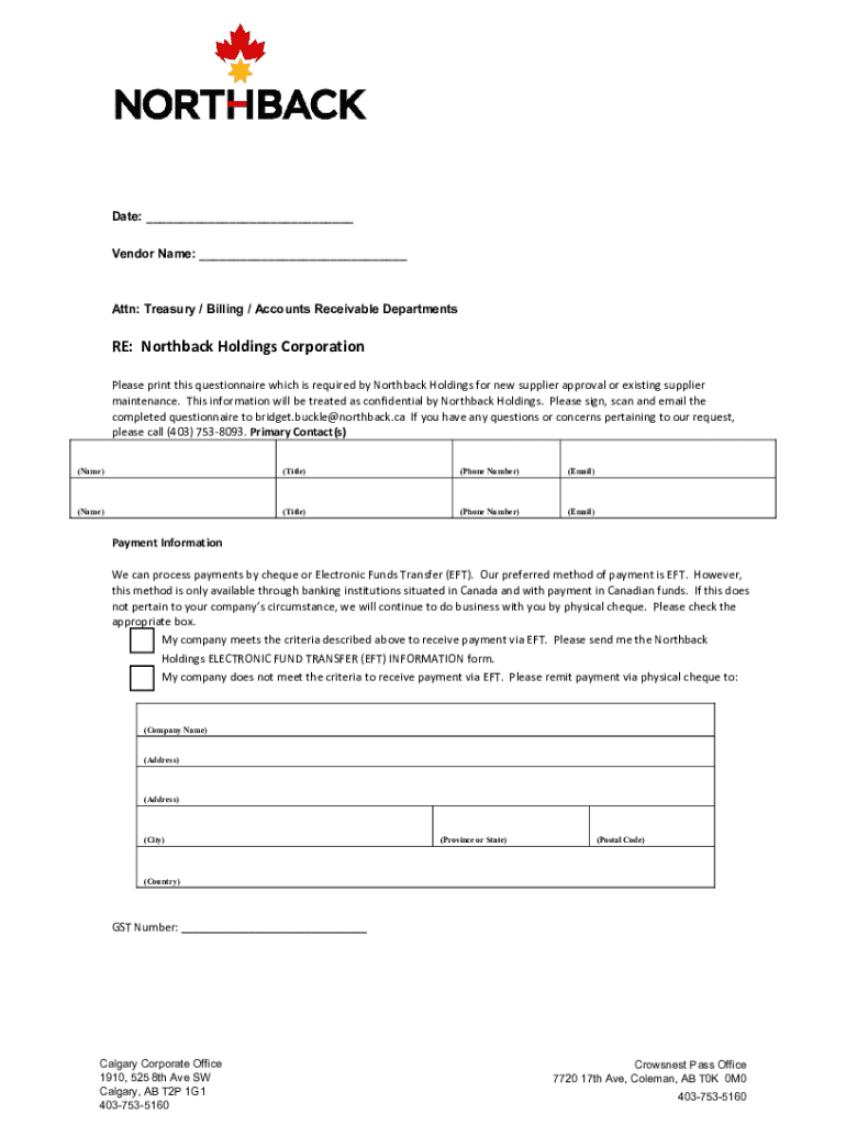 Date: ___ Vendor Name: ___Attn: Treasury / Billing / Accounts Receivable DepartmentsRE: Northback Holdings Corporation Please print this questionnaire which is required by Northback Holdings for new