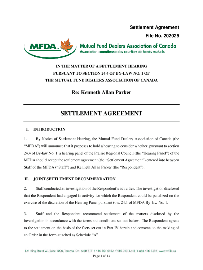 Settlement Agreement File No. 202025IN THE MATTER OF A SETTLEMENT HEARING PURSUANT TO SECTION 24.4 OF BYLAW NO. 1 OF THE MUTUAL FUND DEALERS ASSOCIATION OF CANADARe: Kenneth Allan ParkerSETTLEMENT