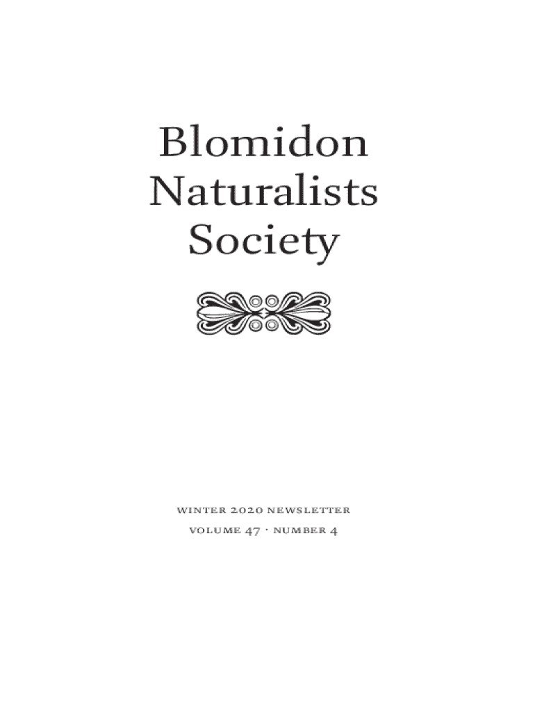 The winter 2020 newsletter of the Blomidon Naturalists Society, focusing on promoting an understanding and appreciation of nature among its members. This issue includes articles on local wildlife, conservation efforts, field trips, and personal stories related to nature and the environment.