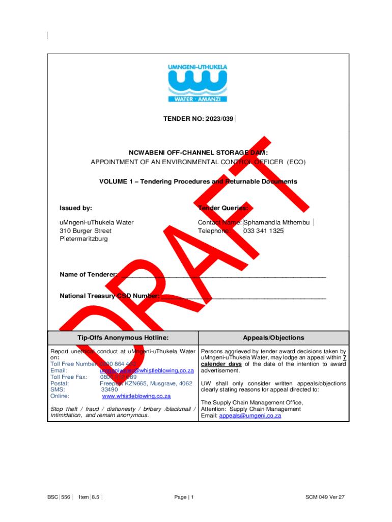 TENDER NO: 2023/039NCWABENI OFFCHANNEL STORAGE DAM: APPOINTMENT OF AN ENVIRONMENTAL CONTROL OFFICER (ECO) VOLUME 1 Tendering Procedures and Returnable DocumentsIssued by:Tender Queries:uMngeniuThukela