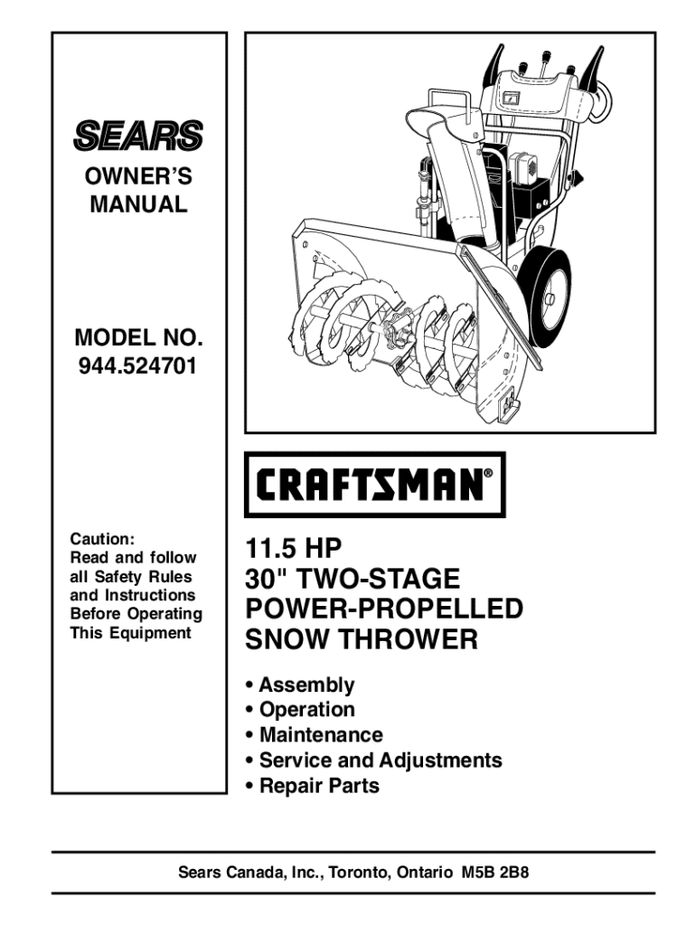OWNERS MANUALMODEL NO. 944.524701Caution: Read and follow all Safety Rules and Instructions Before Operating This Equipment11.5 HP 30\" TWOSTAGE POWERPROPELLED SNOW THROWER Assembly Operation Maintenance