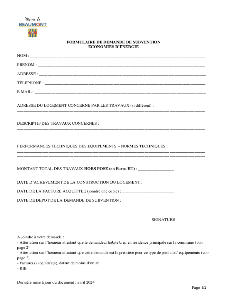 FORMULAIRE DE DEMANDE DE SUBVENTION ECONOMIES DENERGIE NOM : ___ PRENOM : ___ ADRESSE : ___ TELEPHONE : ___ E MAIL : ___ADRESSE DU LOGEMENT CONCERNE PAR LES TRAVAUX (si diffrent) : ___DESCRIPTIF DES