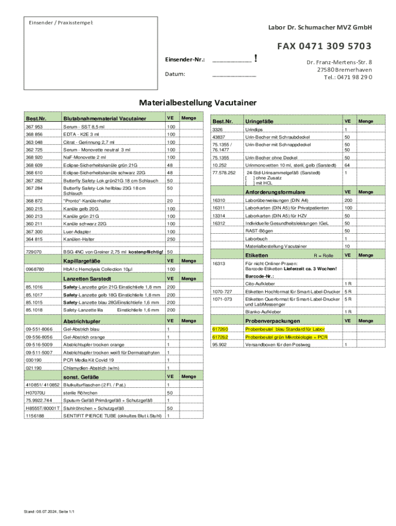 Einsender / Praxisstempel:Labor Dr. Schumacher MVZ GmbHEinsenderNr.:___Datum:___FAX 0471 309 5703 Dr. FranzMertensStr. 8 27580 Bremerhaven Tel.: 0471 98 29 0Materialbestellung Vacutainer Best.Nr.Blutabnahmematerial