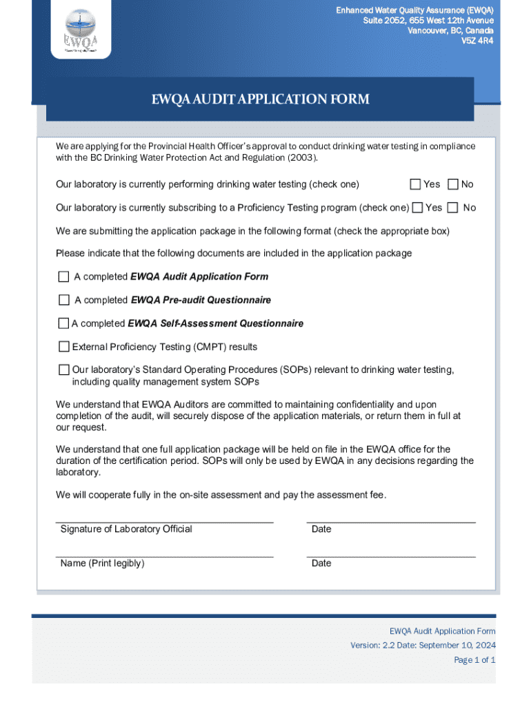 Enhanced Water Quality Assurance (EWQA) Suite 2052, 655 West 12th Avenue Vancouver, BC, Canada V5Z 4R4EWQA AUDIT APPLICATION FORM We are applying for the Provincial Health Officers approval to conduct
