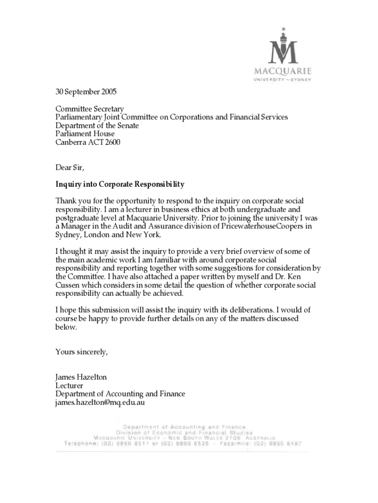 30 September 2005 Committee Secretary Parliamentary Joint Committee on Corporations and Financial Services Department of the Senate Parliament House Canberra ACT 2600 Dear Sir, Inquiry into Corporate
