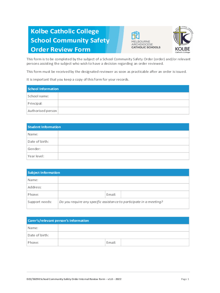This form is designed for individuals subject to a School Community Safety Order or relevant persons assisting them, to request a review of the decision regarding the order. It is essential to complete this form and submit it for internal review promptly after the order is issued, ensuring the individual keeps a copy for their records.