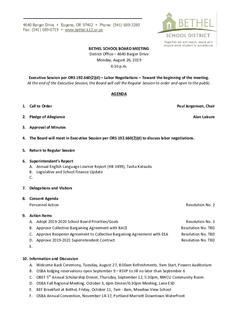 4640 Barger Drive Eugene, OR 97402 Phone: (541) 6893280 Fax: (541) 6890719 www.bethel.k12.or.usBETHEL SCHOOL BOARD MEETING District Office 4640 Barger Drive Monday, August 26, 2019 6:30 p.m. Executive