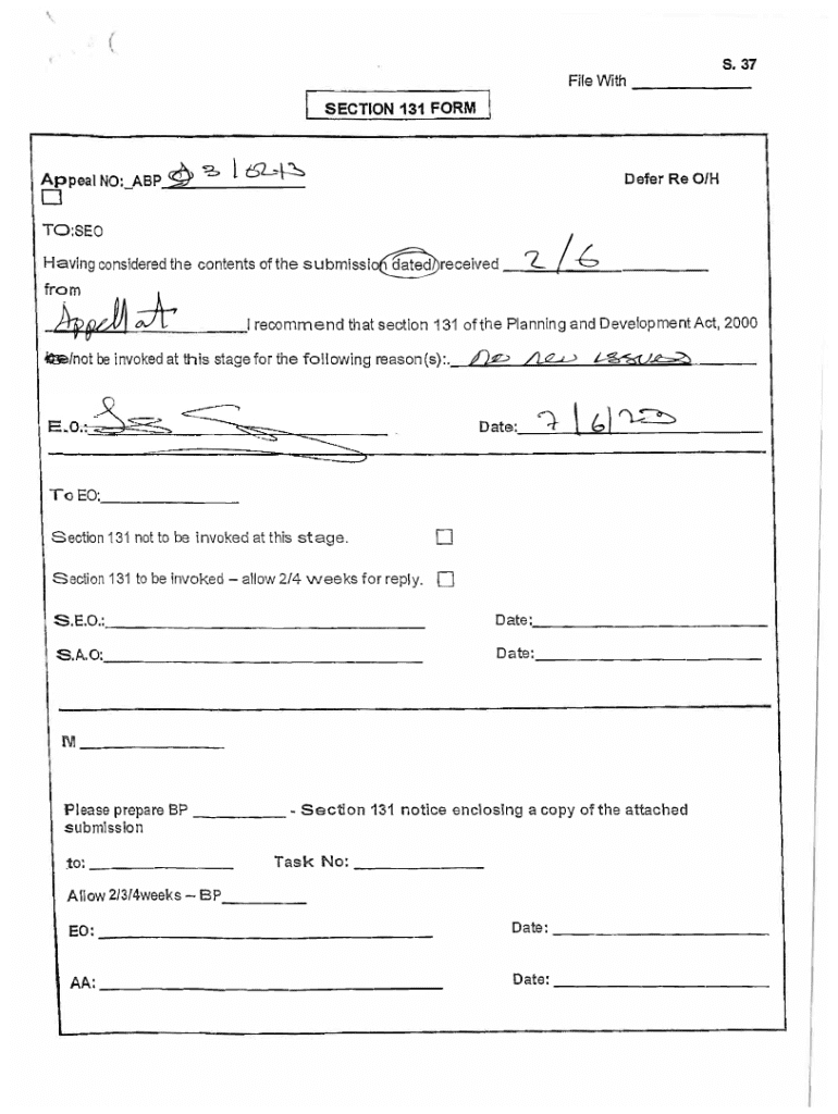 File WithSECTION 131 FORMAppeal NO: ABP ltSLTO:SEODefer Re 0/HHaving considered the contents of the submissi fromA;,A;7[\'S.37l L received __ ___ ...;::_+ _I reoomm end that section 131 of the Planning