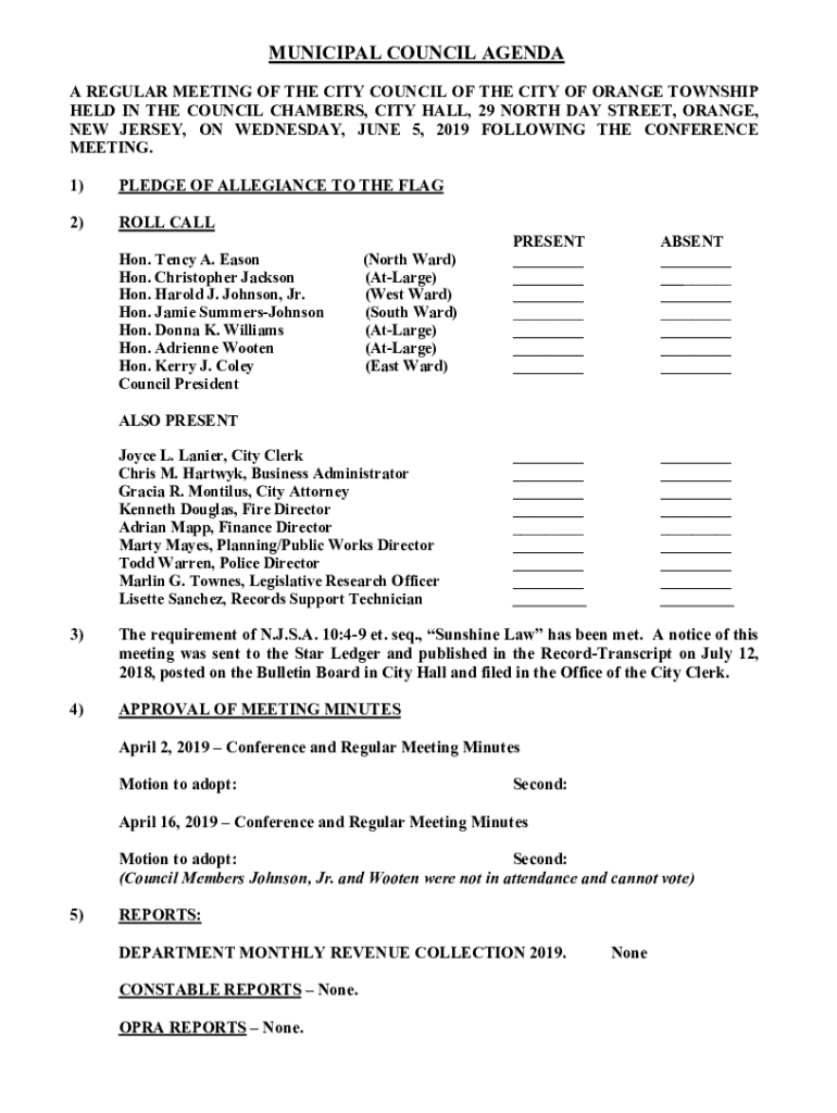 MUNICIPAL COUNCIL AGENDA A REGULAR MEETING OF THE CITY COUNCIL OF THE CITY OF ORANGE TOWNSHIP HELD IN THE COUNCIL CHAMBERS, CITY HALL, 29 NORTH DAY STREET, ORANGE, NEW JERSEY, ON WEDNESDAY, JUNE 5,