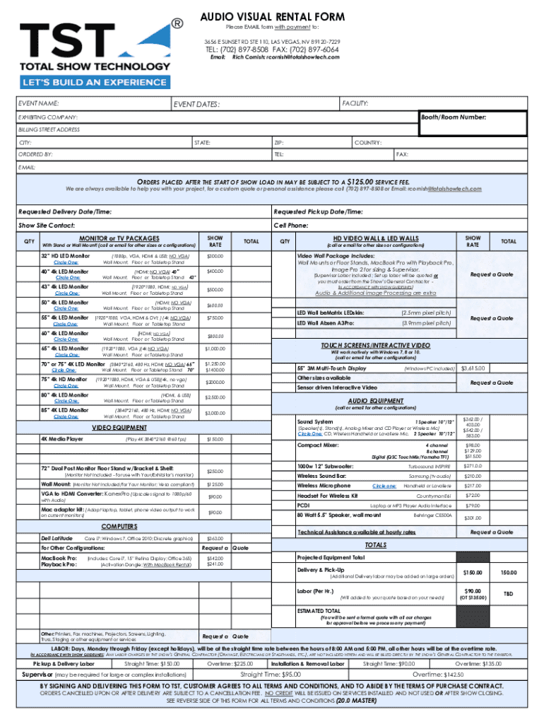 This form is used for the rental of audio visual equipment for events. It details the instructions for renting equipment, payment methods, service fees, and terms of agreement between the customer and Total Show Technology. The form includes sections for customer information, event specifics, equipment specifications, and pricing.