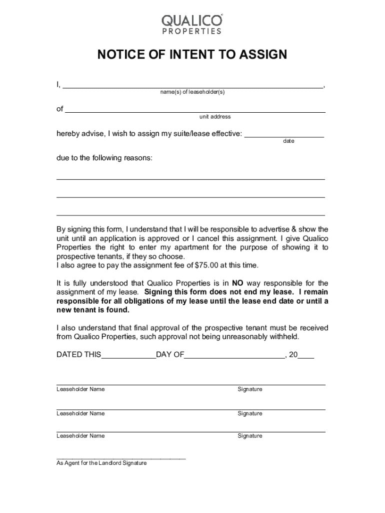 This document serves as a formal notice by leaseholders to assign their lease/suite to another party, detailing the responsibilities and conditions surrounding the assignment process, including the fees and obligations that remain with the original leaseholder until a new tenant is approved.