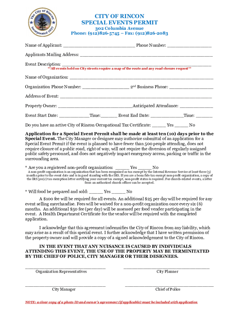 This document serves as an application for a Special Events Permit in the City of Rincon. It includes sections for the applicant\'s information, event details, and required certifications. The form outlines the conditions for hosting events, including fees, organizational status, and requirements for food sales, along with indemnification clauses and property owner\'s agreements.