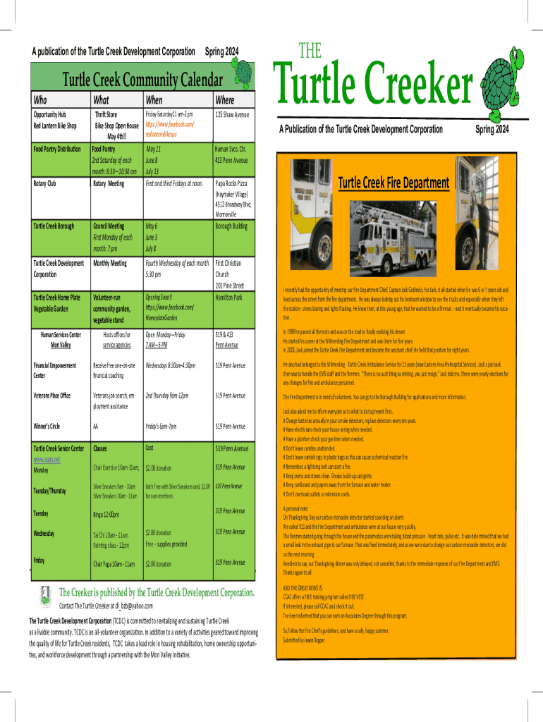 A publication of the Turtle Creek Development CorporationSpring 2024Turtle Creek Community Calendar WhoWhatOpportunity Hub Red Lantern Bike ShopThrift Store Bike Shop Open House May 4th!! Food Pantry