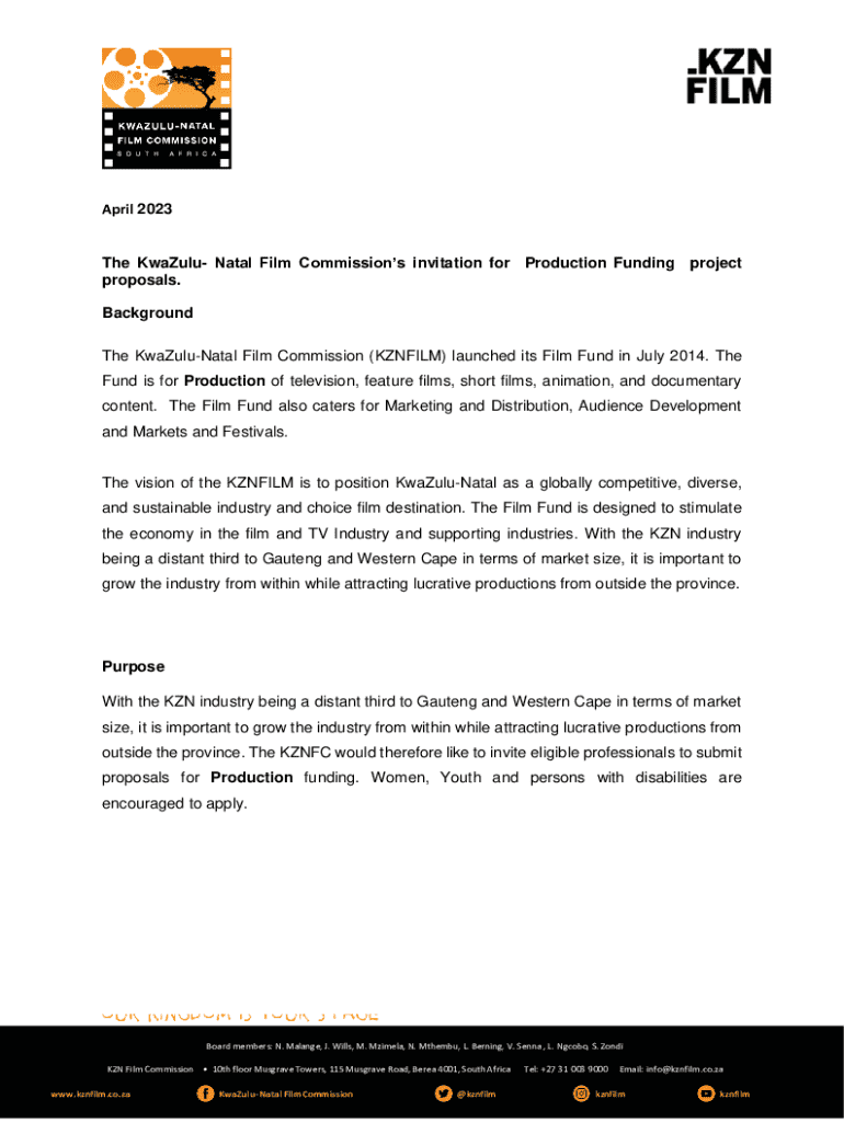 April 2023 The KwaZulu Natal Film Commissions invitation for Production Funding project proposals. Background The KwaZuluNatal Film Commission (KZNFILM) launched its Film Fund in July 2014. The Fund