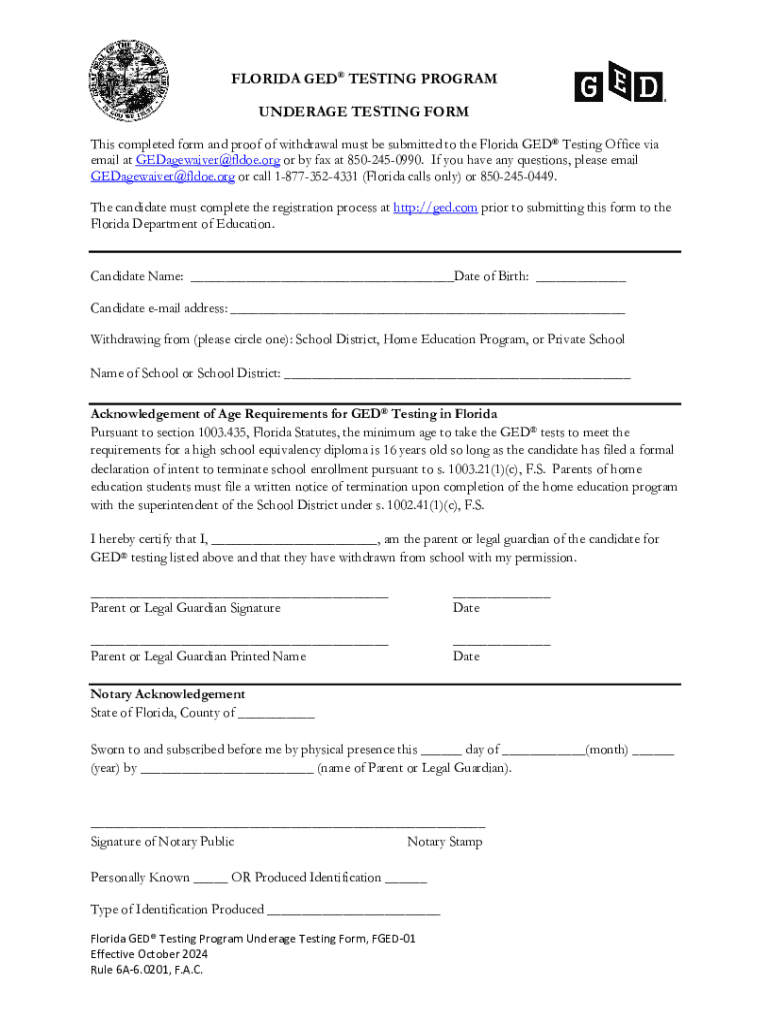 FLORIDA GED TESTING PROGRAM UNDERAGE TESTING FORM This completed form and proof of withdrawal must be submitted to the Florida GED Testing Office via email at GEDagewaiver@fldoe.org or by fax at 8502450990.