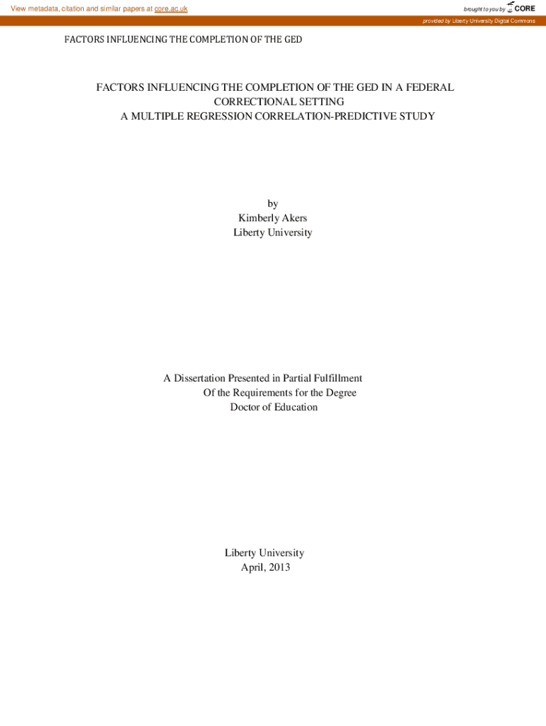 View metadata, citation and similar papers at core.ac.ukbrought to you byCOREprovided by Liberty University Digital CommonsFACTORS INFLUENCING THE COMPLETION OF THE GEDFACTORS INFLUENCING THE COMPLETION