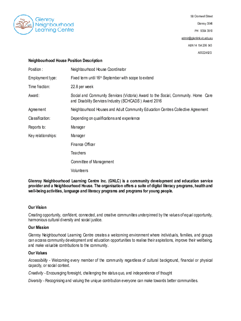 5B Cromwell Street Glenroy 3046 PH 9304 3910 admin@glenlink.vic.edu.au ABN 14 154 206 543 A0022452GNeighbourhood House Position Description Position :Neighbourhood House CoordinatorEmployment type:Fixed