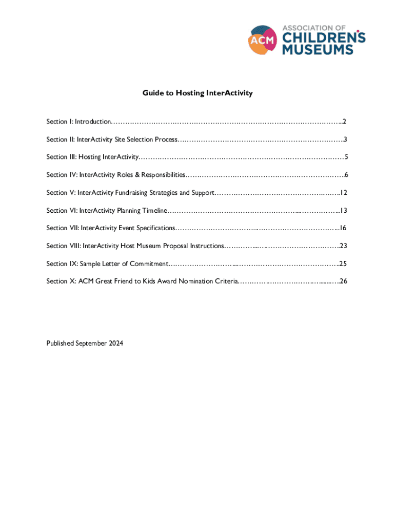This guide provides detailed information for member museums interested in hosting the InterActivity conference organized by the Association of Children\'s Museums (ACM). It outlines site selection processes, roles, and responsibilities of the host museum, fundraising strategies, event specifications, and planning timelines necessary to successfully host the event. InterActivity serves as a vital annual gathering for professionals in the children’s museum field to network, share best...