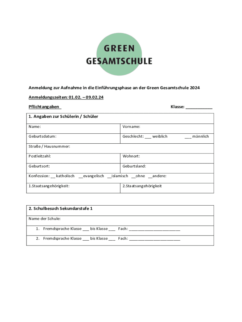 Anmeldung zur Aufnahme in die Einfhrungsphase an der Green Gesamtschule 2024 Anmeldungszeiten: 01.02. 09.02.24 PflichtangabenKlasse: ___1. Angaben zur Schlerin / Schler Name:Vorname:Geburtsdatum:Geschlecht: