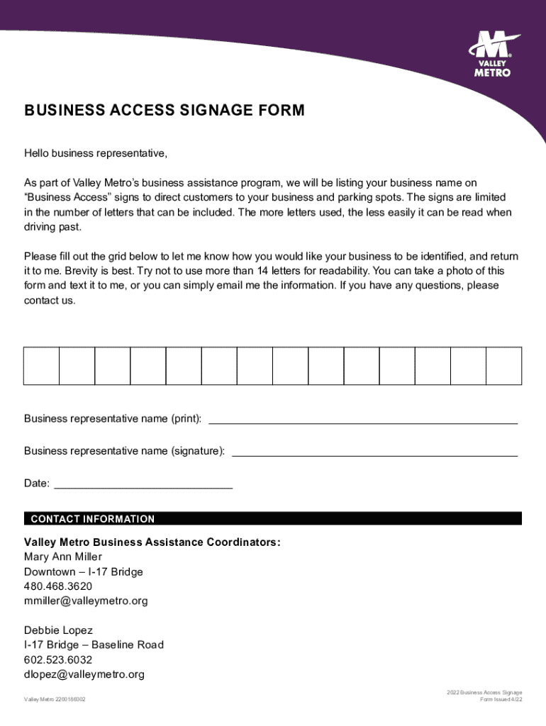 This form is part of Valley Metro\'s business assistance program, designed to collect business name preferences for \'Business Access\' signs to guide customers to businesses and parking spots. It emphasizes readability and brevity in the displayed business name.