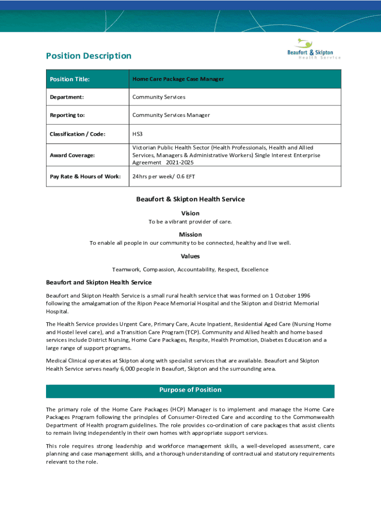 Position Description Position Title:Home Care Package Case ManagerDepartment:Community ServicesReporting to:Community Services ManagerClassification / Code:HS3Award Coverage:Victorian Public Health