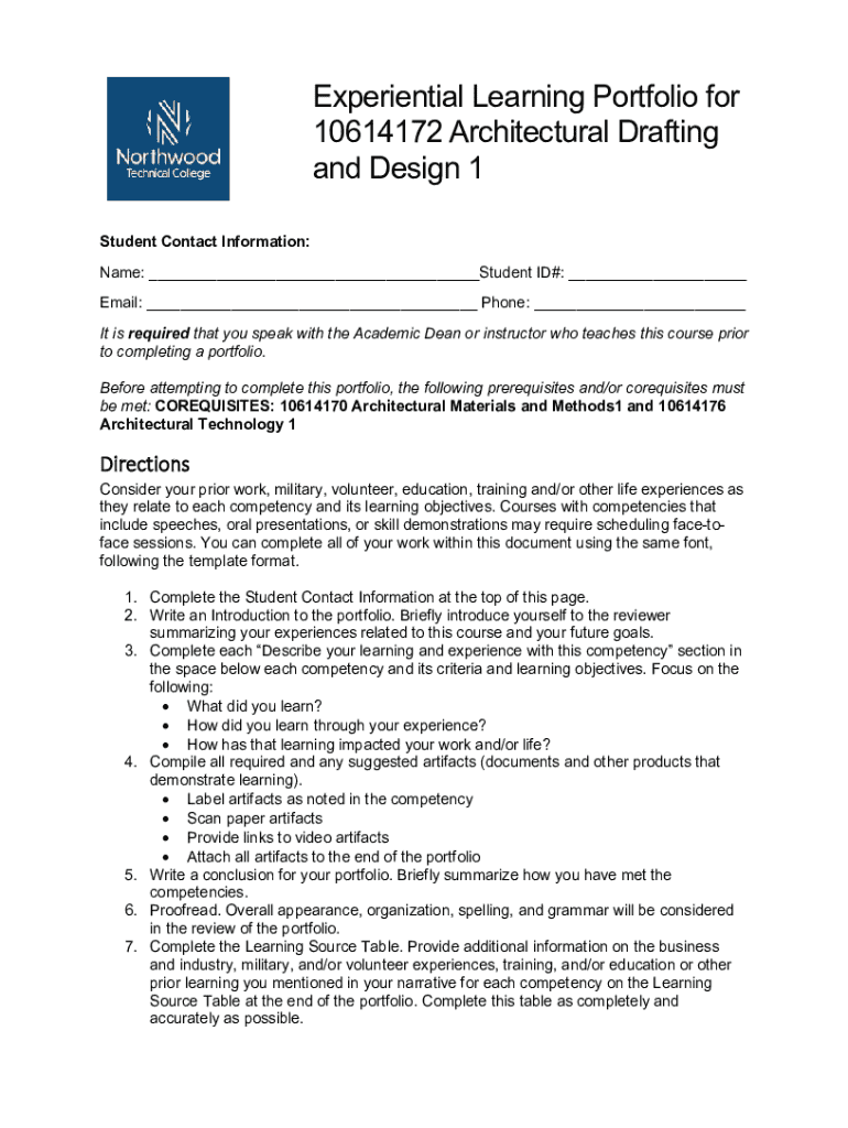 Experiential Learning Portfolio for 10614172 Architectural Drafting and Design 1 Student Contact Information: Name: ___Student ID#: ___ Email: ___ Phone: ___ It is required that you speak with the