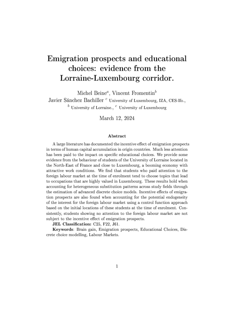 Emigration prospects and educational choices: evidence from the LorraineLuxembourg corridor. abMichel Beine , Vincent FromentinbcUniversity of Luxembourg, IZA, CESIfo., University of Lorraine., c