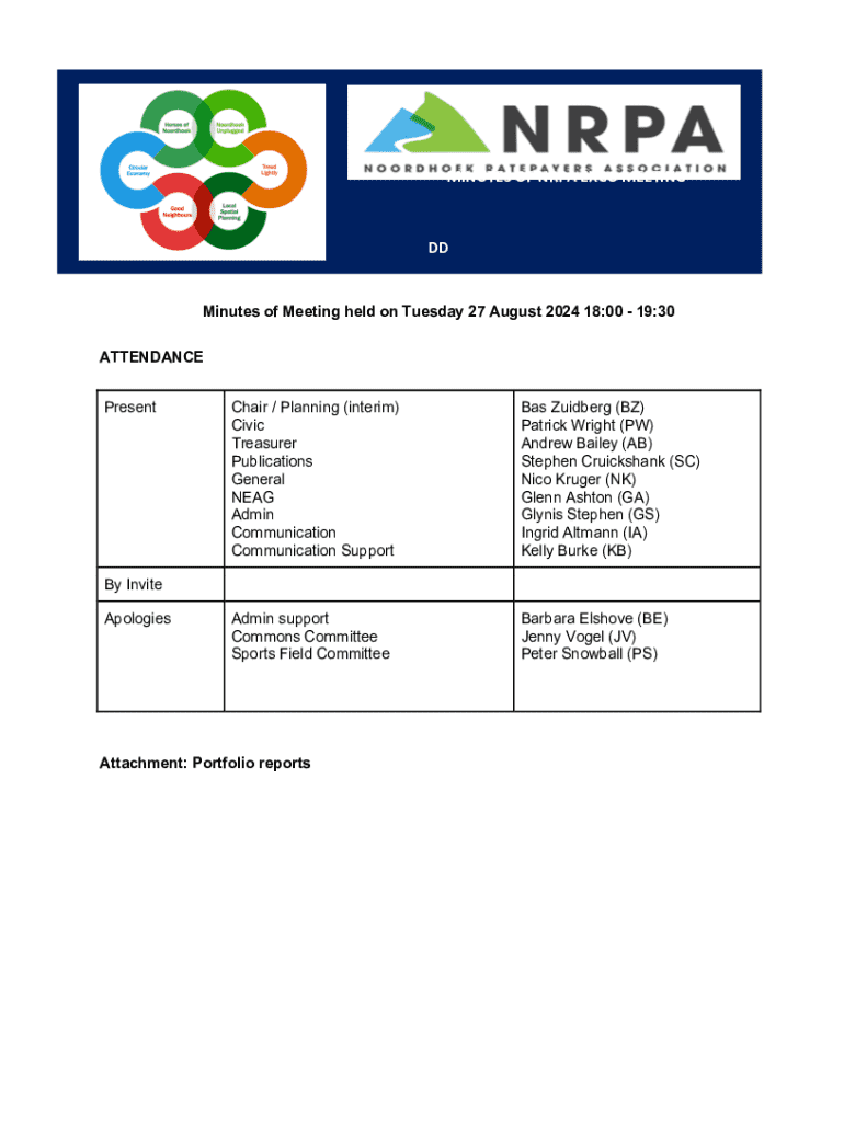 Letter MINUTES OF NRPA EXCO MEETINGDDMinutes of Meeting held on Tuesday 27 August 2024 18:00 19:30 ATTENDANCE PresentChair / Planning (interim) Civic Treasurer Publications General NEAG Admin Communication