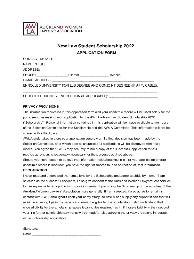 This application form is for the AWLA - New Law Student Scholarship 2022. It collects personal and academic information from applicants to assess eligibility for the scholarship, ensuring data privacy and secure handling of the application.