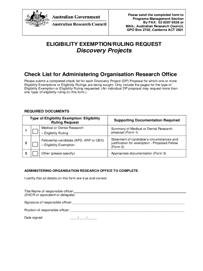 Get the free ELIGIBILITY EXEMPTION/RULING REQUEST - Discovery Projects - mailman anu edu