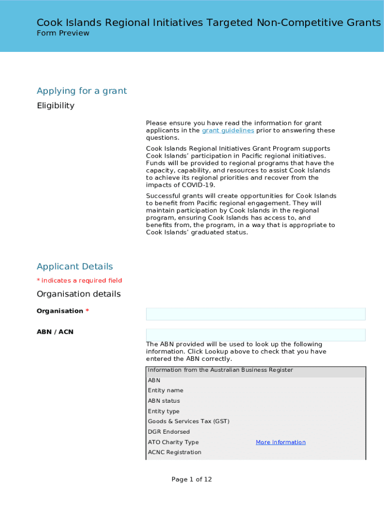 Cook Islands Regional Initiatives Targeted NonCompetitive Grants Form PreviewApplying for a grant Eligibility Please ensure you have read the information for grant applicants in the grant guidelines