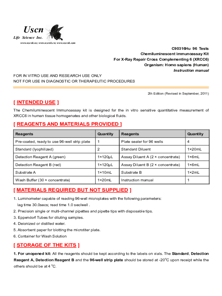 This instruction manual provides guidance for using the Chemiluminescent Immunoassay kit designed for the sensitive quantitative measurement of XRCC6 in human tissue homogenates and biological fluids. The kit includes all necessary reagents and materials for conducting the assay and emphasizes strict adherence to procedures for optimal results.