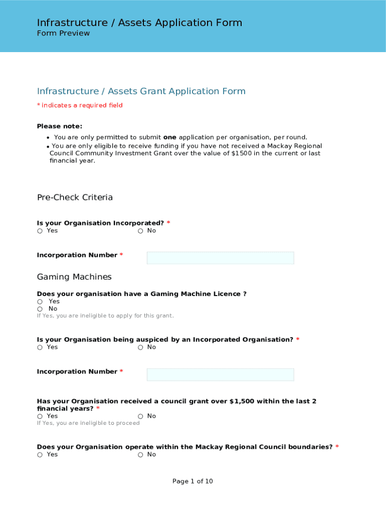 This form is intended for organisations seeking funding for infrastructure or asset projects within the Mackay Regional Council boundaries. It outlines eligibility criteria, application requirements, and necessary supporting documents. Applicants must provide details about their organisation, project impact, budget, and financial statements, along with a declaration of authority and truthfulness.