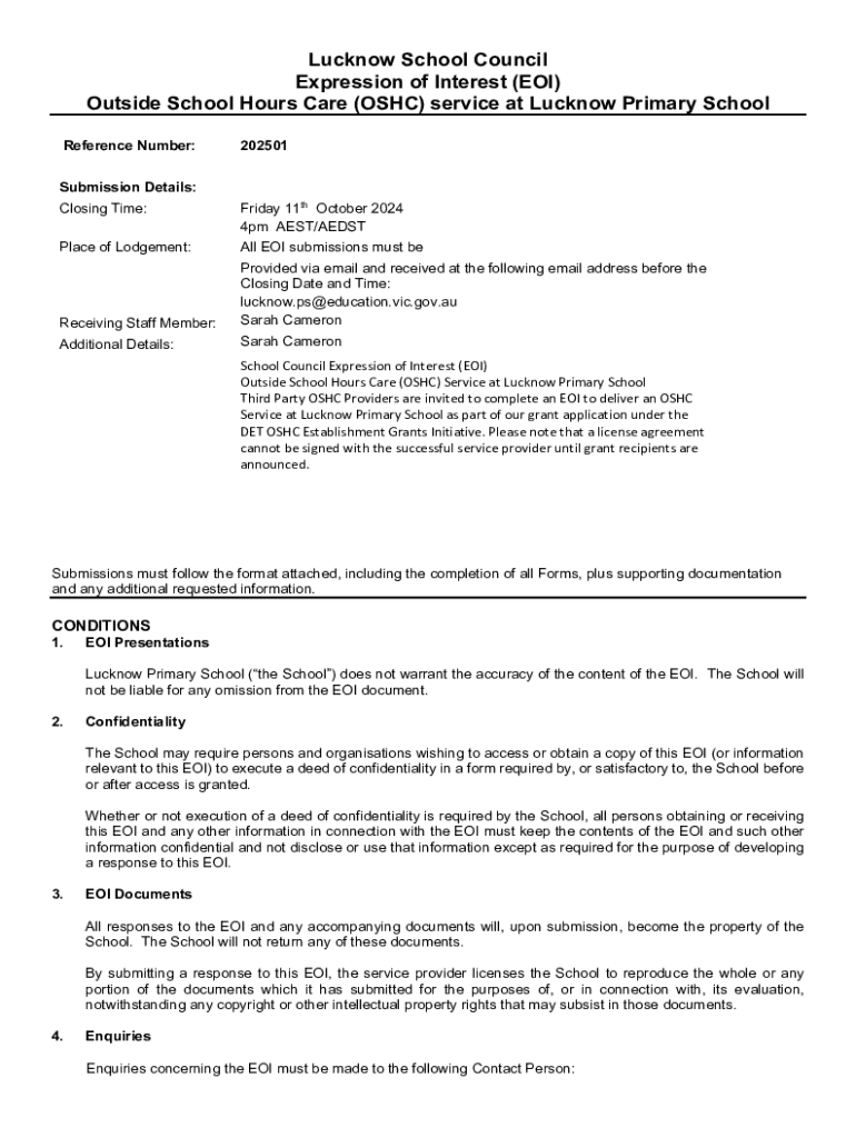 This document invites third-party OSHC providers to submit Expressions of Interest (EOI) to deliver Outside School Hours Care services at Lucknow Primary School, as part of the school\'s grant application under the DET OSHC Establishment Grants Initiative. It outlines submission details, conditions, and scope of services required, including compliance with National Laws and Child Safe Standards.