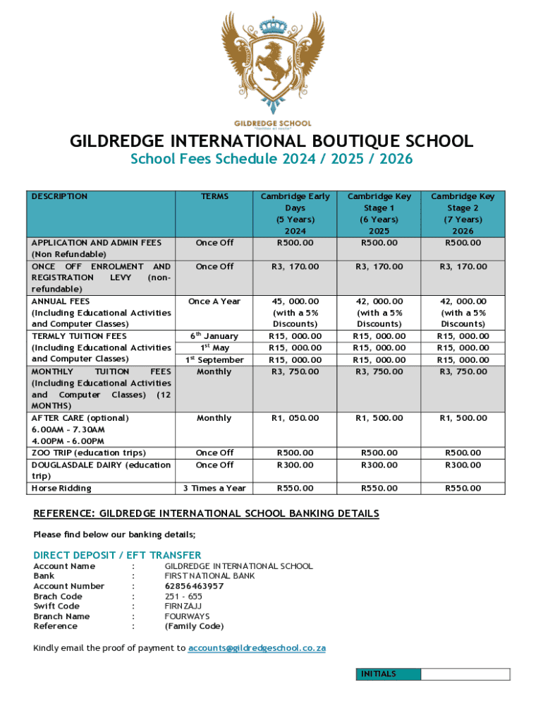 GILDREDGE INTERNATIONAL BOUTIQUE SCHOOL School Fees Schedule 2024 / 2025 / 2026DESCRIPTIONTERMSAPPLICATION AND ADMIN FEES (Non Refundable) ONCE OFF ENROLMENT AND REGISTRATION LEVY (nonrefundable)