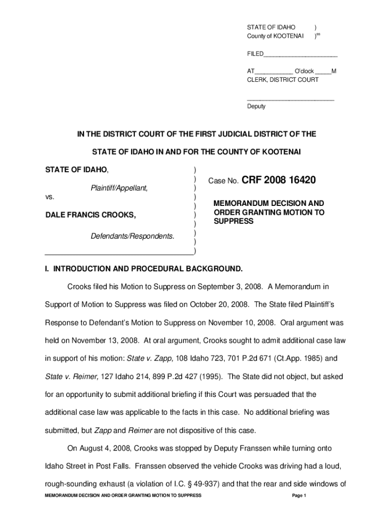 STATE OF IDAHO County of KOOTENAI) )ssFILED___ AT___ Oclock ___M CLERK, DISTRICT COURT ___ DeputyIN THE DISTRICT COURT OF THE FIRST JUDICIAL DISTRICT OF THE STATE OF IDAHO IN AND FOR THE COUNTY OF