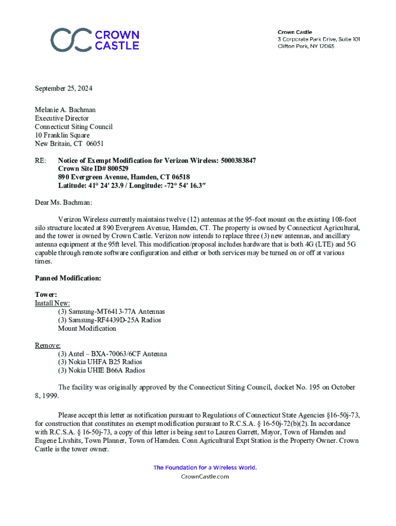 September 25, 2024 Melanie A. Bachman Executive Director Connecticut Siting Council 10 Franklin Square New Britain, CT 06051 RE:Notice of Exempt Modification for Verizon Wireless: 5000383847 Crown
