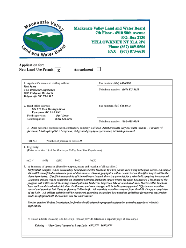 yenzie Va lle ack Mar da o nd Water BdLanApplication for: New Land Use PermitXAmendment1. Applicants name and mailing address: Paul Jones GGL Diamond Corporation 6005 Finlayson Dr. North Yellowknife
