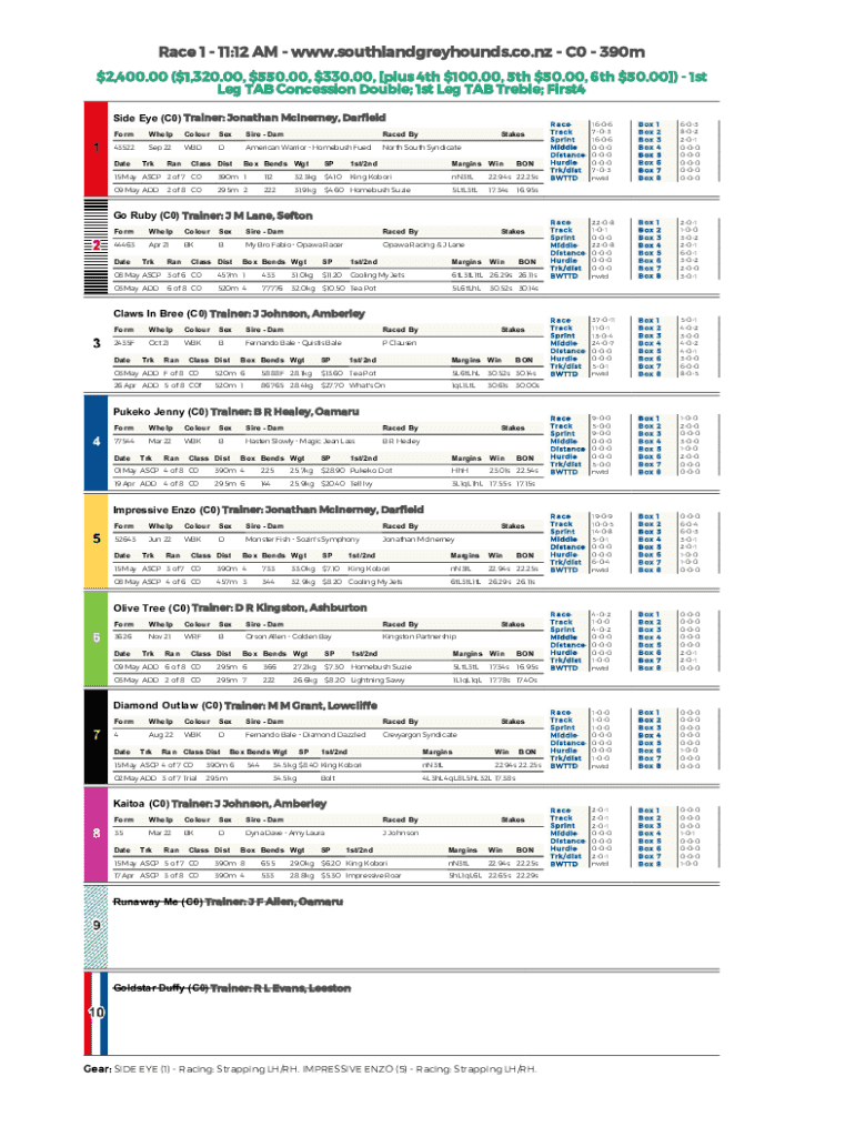 Race 1 11:12 AM www.southlandgreyhounds.co.nz C0 390m $2,400.00 ($1,320.00, $550.00, $330.00, [plus 4th $100.00, 5th $50.00, 6th $50.00]) 1st Leg TAB Concession Double; 1st Leg TAB Treble; First4