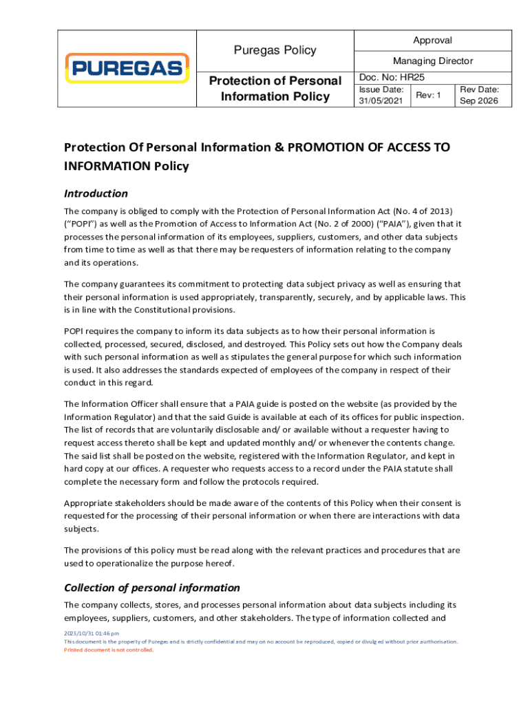 ApprovalPuregas Policy Managing DirectorProtection of Personal Information PolicyDoc. No: HR25 Issue Date: 31/05/2021Rev: 1Rev Date: Sep 2026Protection Of Personal Information & PROMOTION OF ACCESS