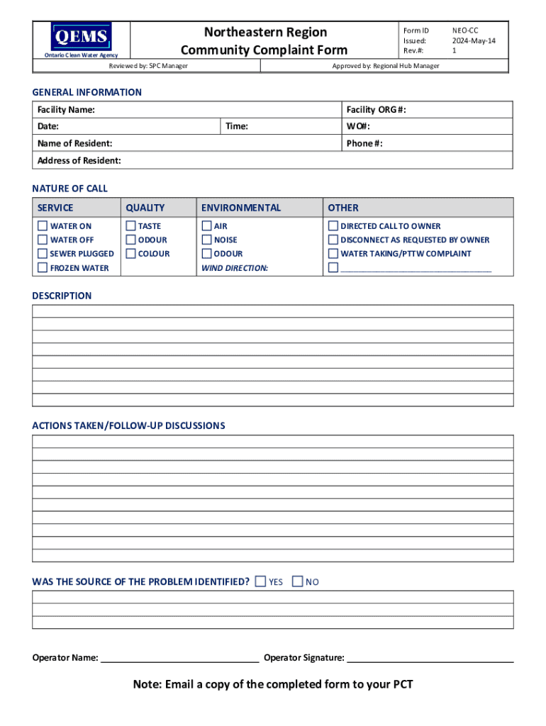 Northeastern Region Community Complaint FormOntario Clean Water AgencyReviewed by: SPC ManagerForm ID Issued: Rev.#:NEOCC 2024May14 1Approved by: Regional Hub ManagerGENERAL INFORMATION Facility Name:Facility