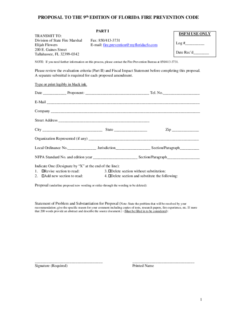 PROPOSAL TO THE 9th EDITION OF FLORIDA FIRE PREVENTION CODE PART I TRANSMIT TO: Division of State Fire Marshal Elijah Flowers 200 E. Gaines Street Tallahassee, FL 323990342DSFM USE ONLYFax: 850/4133731