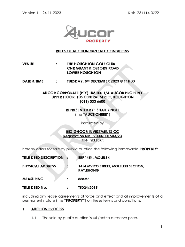 This document outlines the rules and conditions governing the public auction and sale of an immovable property, including details on bidding, payment, and property transfer. It addresses legal obligations, the roles of the auctioneer and seller, auction participation requirements, and provisions for existing tenancies.