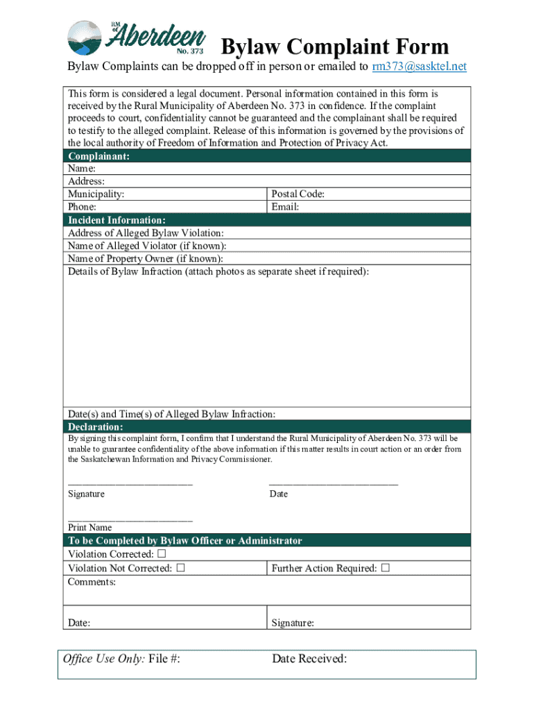 This form is used to submit complaints regarding alleged bylaw violations to the Rural Municipality of Aberdeen No. 373. It serves as a legal document and collects personal and incident information while ensuring the complainant understands the limitations of confidentiality.