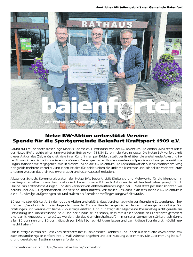Amtliches Mitteilungsblatt der Gemeinde Baienfurtbaienf rter # 39 Freitag, 29. September 2023Netze BWAktion untersttzt Vereine Spende fr die Sportgemeinde Baienfurt Kraftsport 1909 e.V. Grund zur