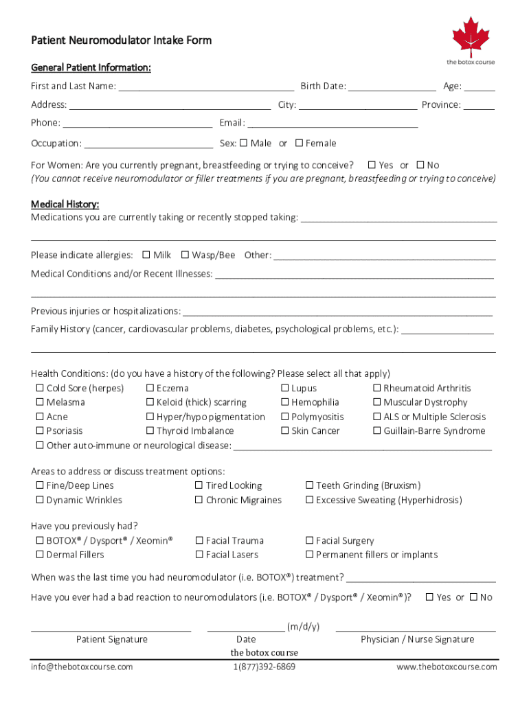 The patient neuromodulator intake form is a document used by healthcare providers to gather essential information about a patient's medical history, current medications, and treatment goals before administering neuromodulator therapies.